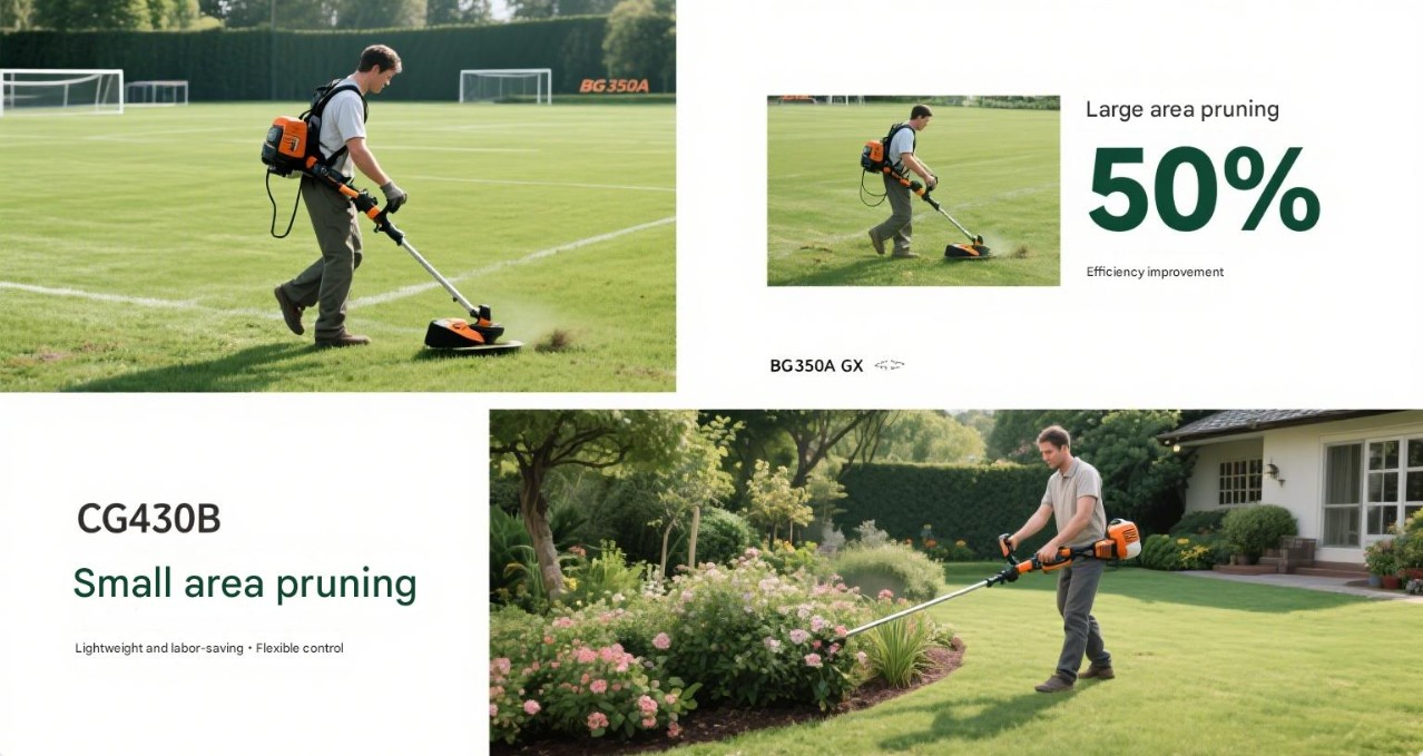 Stort områdeklipping: For klipping av store områder og komplekse terreng, anbefales det å velge en ryggsekkklipper, for eksempel BG151 Kraftig knapsekk penselkutter og BG350A-GX Knapsack 4 Stroke Brush Cutter. Disse modellene er kraftige og har lang batterilevetid, egnet for langsiktige operasjoner, og kan effektivt fullføre klippoppgaver med store områder.