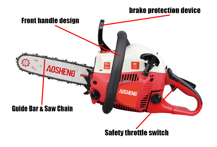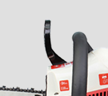 | 02BremsebeskyttelsesenhetBremsesponsen er følsom, forbedrer driftssikkerheten. Frontstyret og bakstyret er gjort til en, med enkel og fast struktur. Trykk på enheten kan stoppe kjedesagen. |